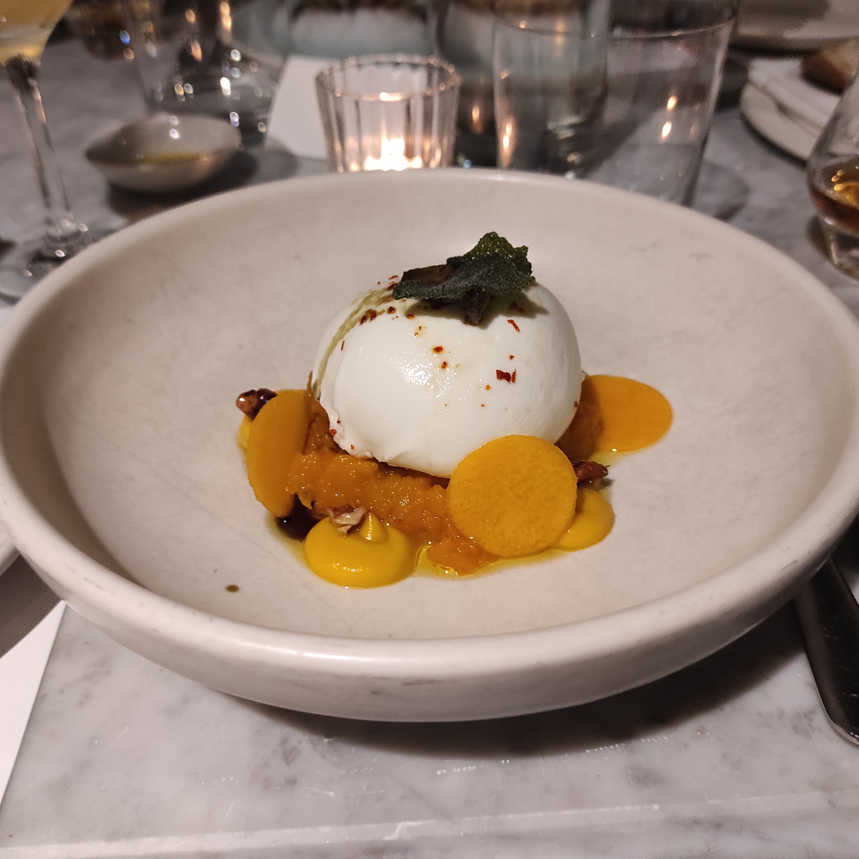 The launch was held at Luca and, well, if you’re going to extol the virtues of an Italian drink, this was an excellent place to entrust the paired food to. The drinks had been overseen by cocktail notable and brand ambassador Rudi Carraro, and on arrival I was handed a delightful Italian Crusta, using the Etichetta Nera, lifted with a touch of patchouli. Some polite small-talk with the disgustingly charming and well-turned-out Italian contingent who’d come in to help explain the Riserva 18 led neatly to an antipasto of burrata with a pumpkin caponata and pickled walnuts.