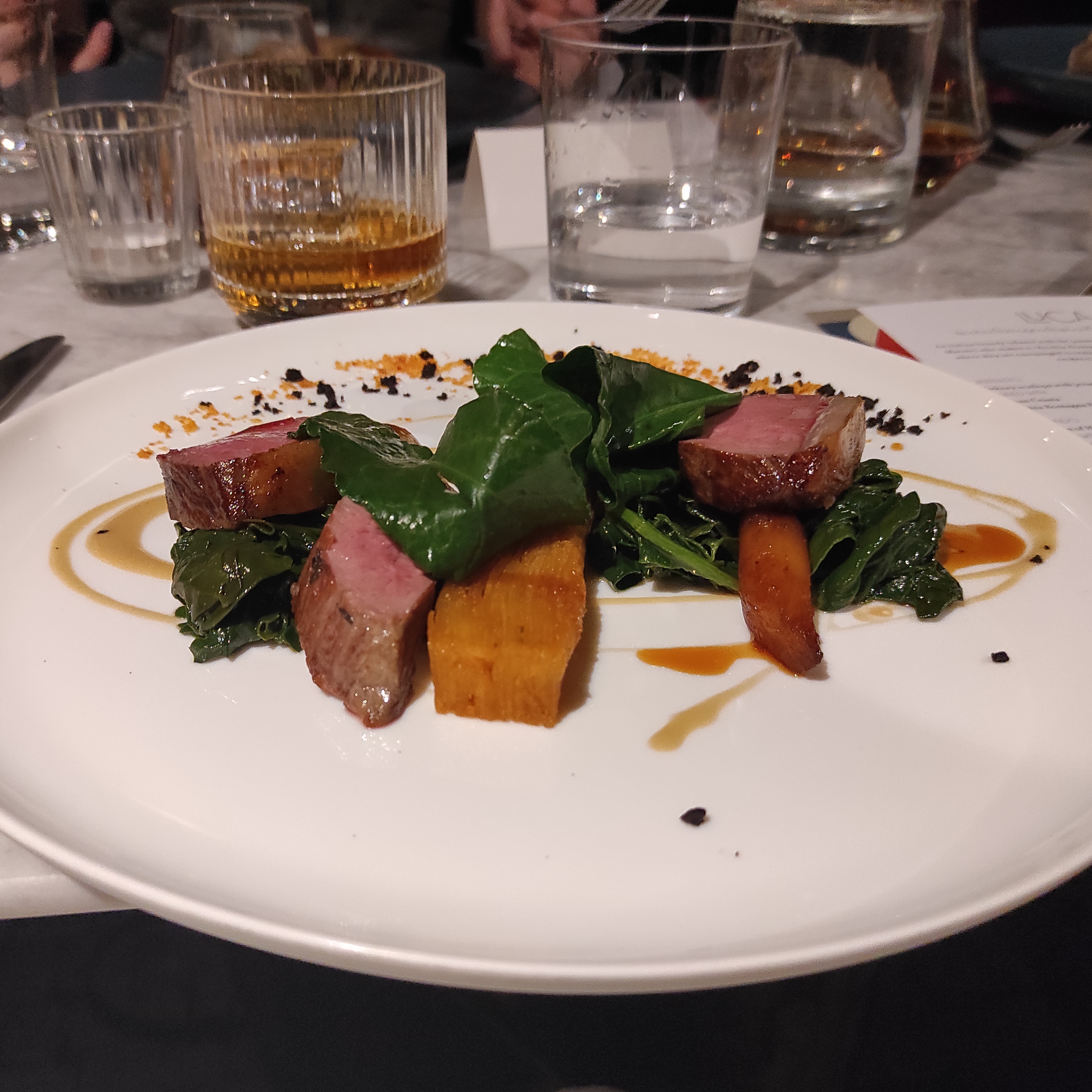 With the secondo (a cannon of hebridean lamb, borlotti bean bagna cauda, roasted salsify, and spinach), came an accompanying Old Fashioned, using their Tre Botti (Three Barrels), fig, the always-welcome Amaro Montenegro and a spritz of bergamot. Tasted separately, the Tre Botti was a little more “grown-up” than the Etichetta Nera, with hints of leather and less perceptual sweetness, though dried tropical fruit notes were still evident, as was citrus peel, dates and figs and vanilla with a hint of bitter almond.